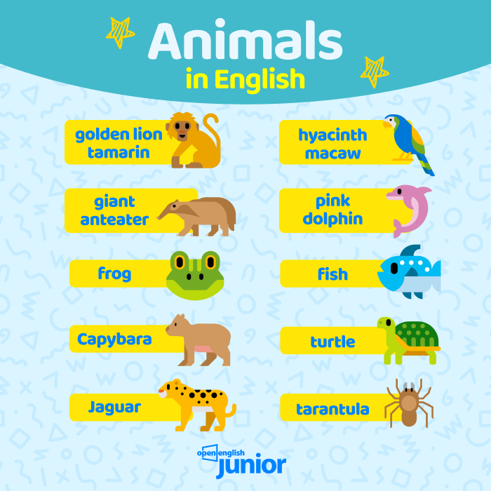 11 de fevereiro de 2021. Author. Jessica Guzman. Aprender o vocabulário animal é divertido, especialmente se você é um amante dos animais e aprecia todas as criaturas deste planeta, do mar ao céu, grandes e pequenas. Conhecimento dos nomes dos animais em inglês é útil por três razões: permite-nos identificar os animais que vemos.