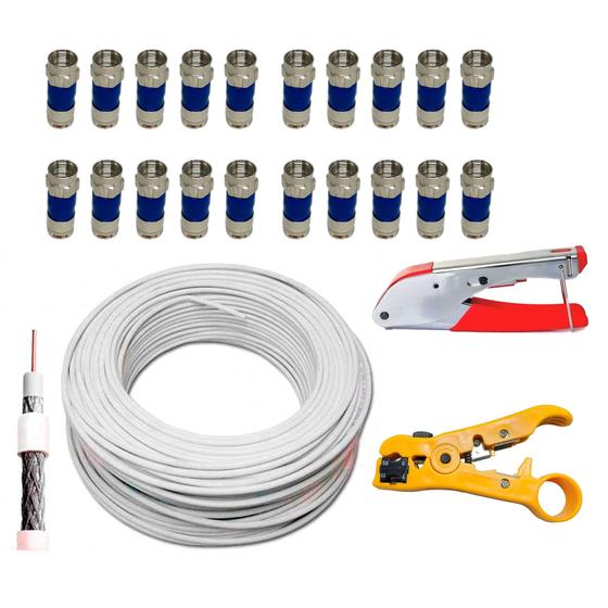 Cabo Coaxial RG6 100 Metros 95 Malha + 20 Conector e Alicate de Compressão com decapador