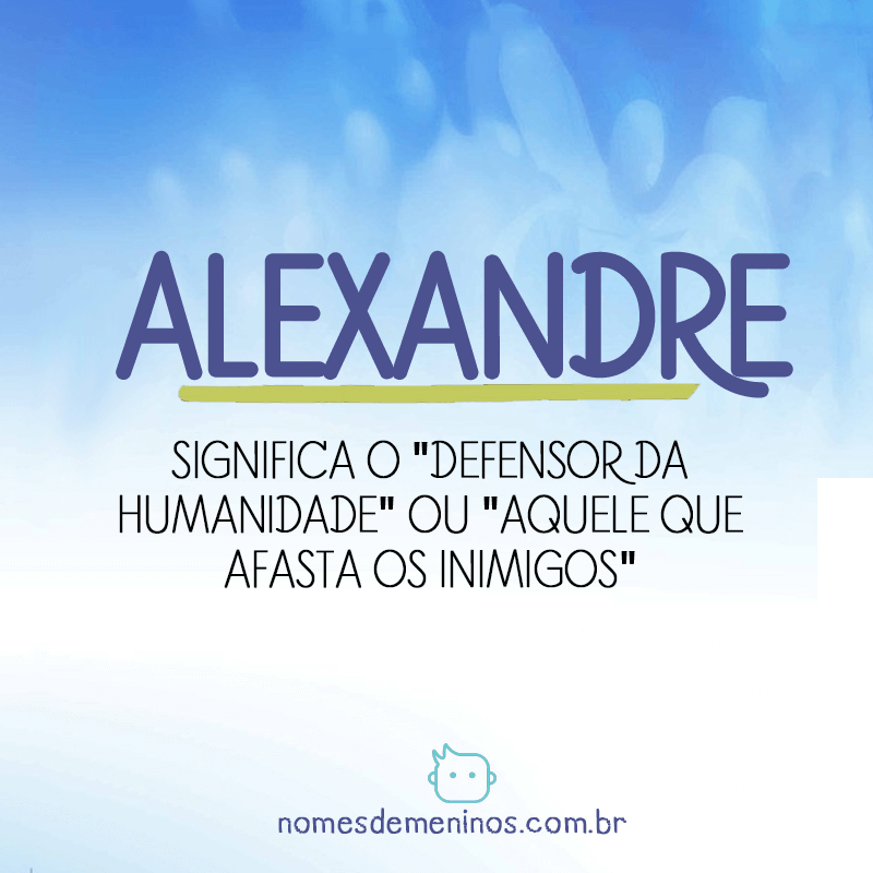 Alexandre é um nome de origem grega que significa "defensor" ou "protetor do povo". O nome Alexandre ficou famoso graças a Alexandre, o Grande, rei da Macedônia que conquistou grande parte do mundo conhecido na época. Alexandre também foi o nome de vários outros líderes importantes ao longo da história, como Alexandre I da.